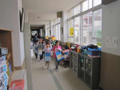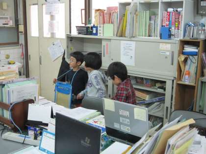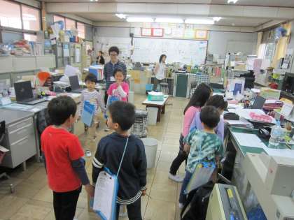 学校たんけんで、1年生と2年生が職員室を訪れました。2年生は、1年生の手本となる挨拶をして職員室に入ります。1年生も、教えられたように声を出してがんばります。みんなとても嬉しそうです。
