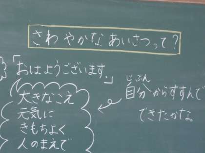 先週から『さわやか週間』が始まっています。この『さわやか週間』では全学年全学級が道徳で「あいさつ」の勉強をすることになっています。