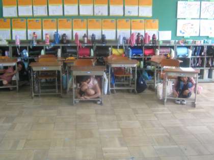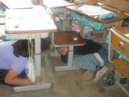 3年生の教室に残っていた児童は,すぐに机の下に隠れて,自分の体を守りました。いつ来るかわからない地震に対して,今年度は月1回程度,訓練を実施します。毎回真剣に取り組むことが大事です。