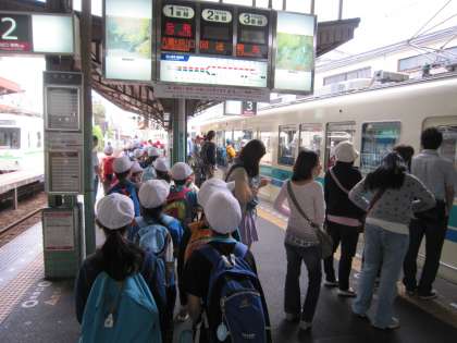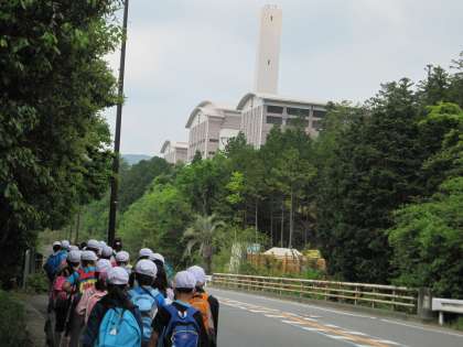 4年生の社会見学に行ってきました。4年生は、社会の学習でゴミの行くえについて学習します。今日は、市原にある東北部クリーンセンターへ行きました。叡電にのって、市原駅まで行き、そこから少し離れたクリーンセンターまで徒歩でてくてく歩いて行きました。歩いている途中に何台もパッカー車とすれ違い、クリーンセンターの煙突が見えると、「あそこや」と声が上がりました。