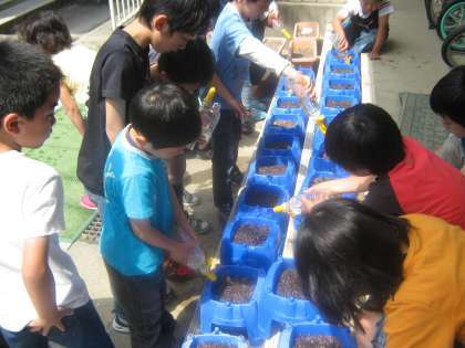 We planted seeds to a flowerpot.But, at first we compared the state of the kind with the kind of other plants in a classroom. The third grader brings up a "touch-me-not" "sunflower" "okra" this year.