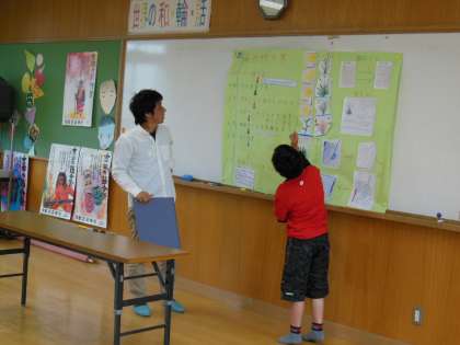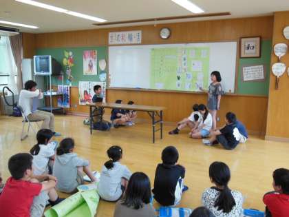 今日は,京都大学大学院でお米のことを研究されている廣岡義博さんに来ていただきました。子どもたちは,自分たちで調べてきたことや活動してきたことを廣岡さんに向けて発表しました。