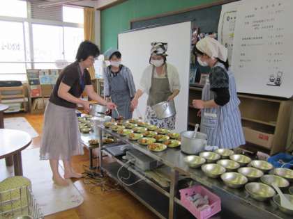 子どもたちの給食の準備を参観されている間、PTAの保健体育委員の方が、配膳を手伝ってくださいました。
