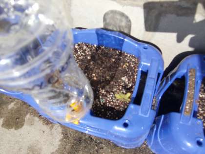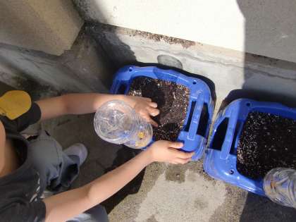 今朝,「校長先生,芽が出てる…!」と言って,1年生が植木鉢の所までいざなってくれくれました。