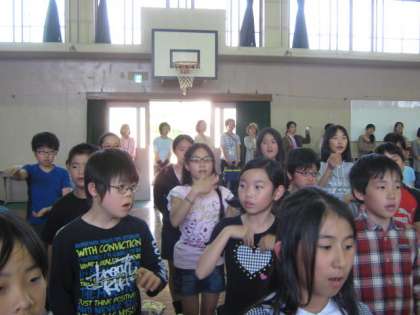 1年生を迎える会での全員参加のゲームと歌の様子です。ゲームもノリノリ,歌では振付を知っている子は,振り付けもして歌っていました。