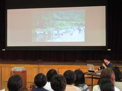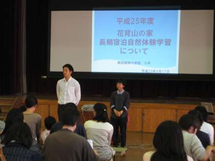 5年生の花背山の家長期宿泊学習の保護者説明会を、1年生を迎える会の後、体育館で行いました。パワーポイントで施設や活動の様子を伝えました。説明を聞いていただいて、5年生の保護者の皆さんに安心していただけたらうれしく思います。
