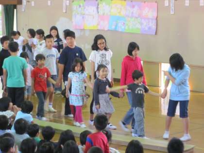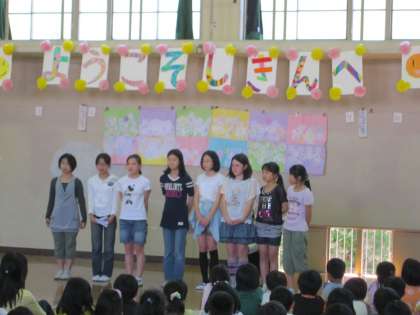 1年生を迎える会は、1年生と6年生が手をつなぎ、2〜5年生までのあたたかい拍手に包まれながら入場しました。体育館はほのぼのとした空気でいっぱいになりました。