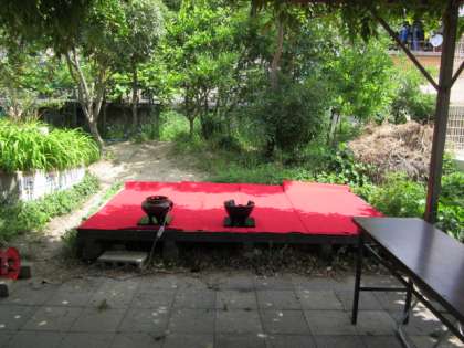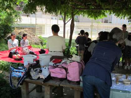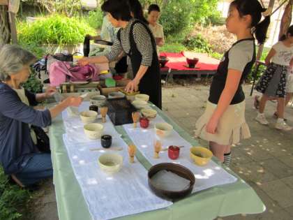 部活動の茶道の子どもがだんだんビオトープに集まって来ました。その前から、地域の指導者の皆さんが来てくださり,準備を初めてくださいました。