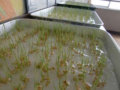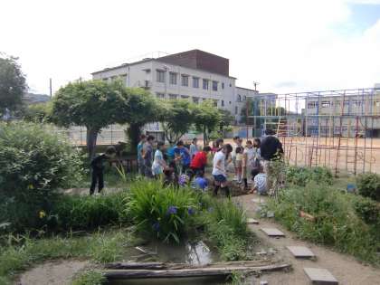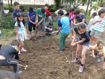 5年生が田んぼの土を掘り起こして田植えの準備に入っています。