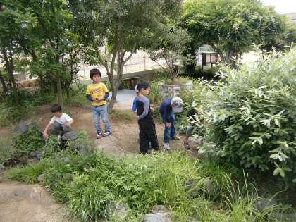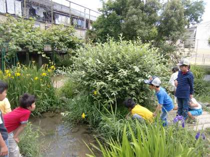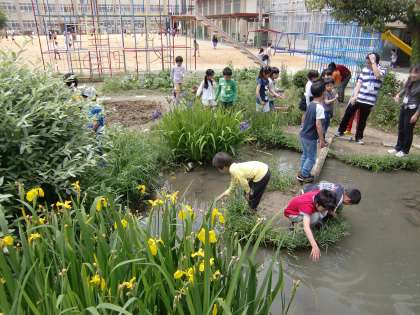 週明け月曜の朝,今日も気温が上がりそうです。ビオトープの池にはいつものように低学年の子が集まっています。