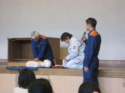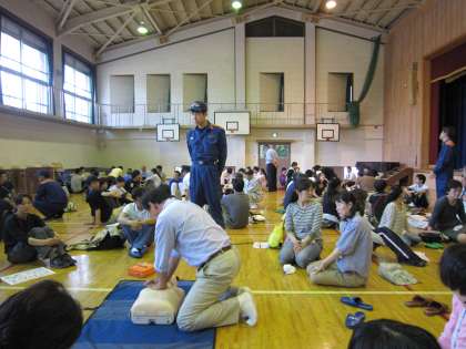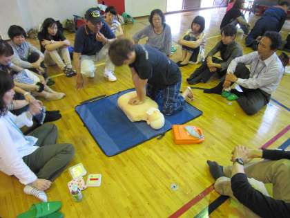 今日の午後、教職員の大半が、普通救命講習実技研修会に参加してきました。水泳シーズンを前に「子どもたちの命を守り切る」の気持ちで真剣に研修を受けてきました。心肺蘇生の方法やAEDの使い方を教えていただき、実際に人形を使って訓練を受けました。