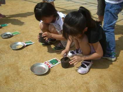 生活科の学習で野菜作りを始めました。みんなで力をあわせて,10種類ほどの野菜を育てていく予定です。昨日種まきをし,今朝は早速水やりに励んでいました。みんなで「早く芽が出ないかな。」と楽しみにしています。