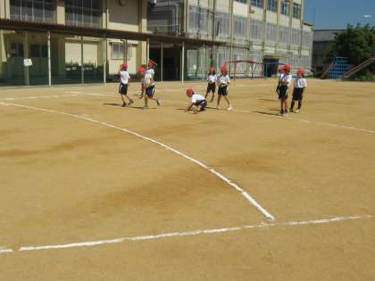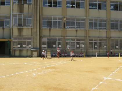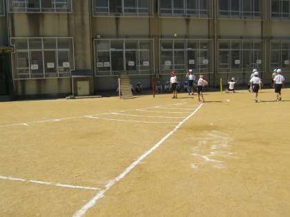 今年度のスポーツテストの最後の種目は「ソフトボール投げ」でした。1組と2組が交代で投げました。投げたボールが落ちて,バウンドが弱くなってから受け止め,投げる場所にいる友だちにもう一度戻すことも協力してできました。
