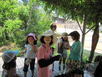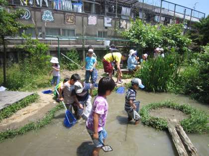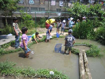 子どもたちの楽しみ方は、いろいろです。生き物を池で探している子。カラスノエンドウの笛で遊ぶ子。顕微鏡をのぞきこんでいる子。夢中になると、とうとう膝まで水につかる子さえでてきました。きょうは、ぬれても、この後授業がないから安心です。