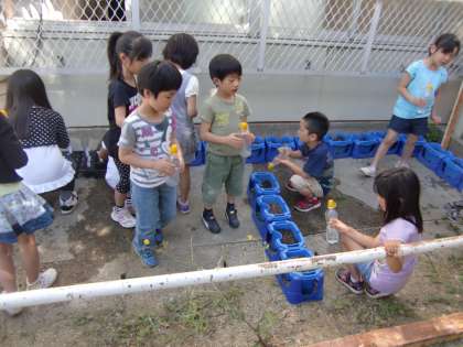 5月24日(金)の朝,2年生は10種類もの野菜に,1年生はアサガオに,それぞれ水をやっています。