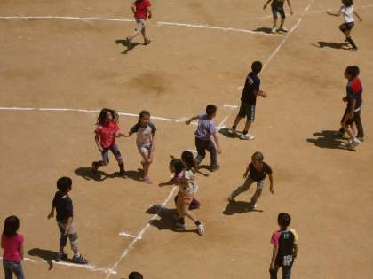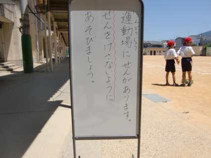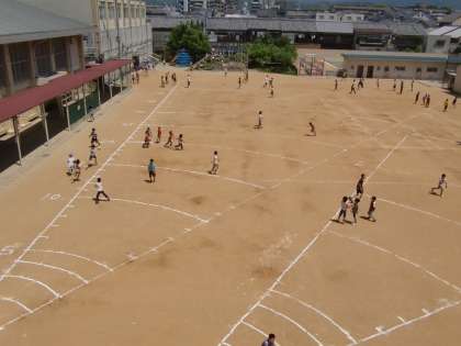 朝休み,中間休み,昼休みと子どもたちは当然運動場に出て遊びます。「線を消さないように遊びましょう」という立て看板1枚で,線を消さないように遊ぶのが四錦の子です。