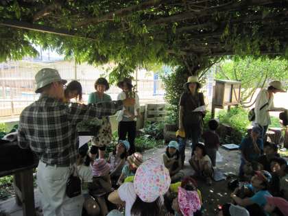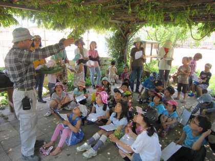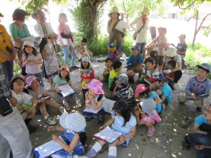 子どもたちは、いっぱい遊んで発見しました。最後にいつもお世話になっているビオトープ委員会の方から、今日の問題の答えを教えていただきました。それだけでなく、カマキリの卵や刺さない毛虫、いろいろな匂いや形の草など知らないことをギュッと固めてお話してくださいました。お世話になり、ありがとうございました。
