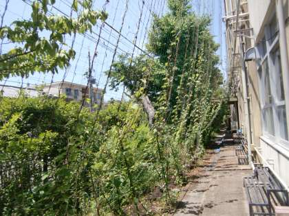今年も『緑のカーテン』を育てています。昨年に引き続き琉球アサガオ。そして,今年新たに3種類のゴーヤ。