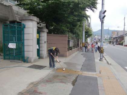 管理用務員がデッキブラシで洗ってくれていますが,こびりついていて簡単にはとれません。