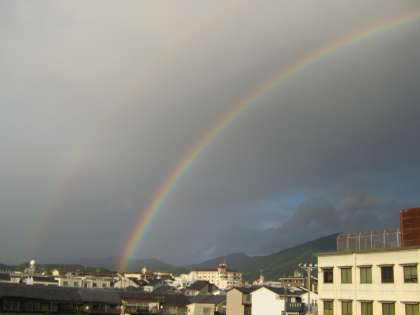 6時間目の学習発表会の練習が終わり,クラスに戻ってみるとある子が,「先生!虹が出てる!」その声に廊下に出て外を見ると,きれいで立派な虹が出ているではありませんか。しかも2重になって。子どもたちの話によると「今日は5回も虹が出た」ということでした。心が「ホッ」とする一時でした。