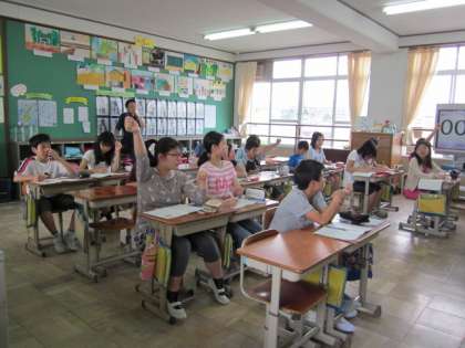 6年1組です。1時間目の算数の様子と3時間目の外国語活動の様子です。外国語活動は”I can 〜”を使って友だちとたずねあいました。