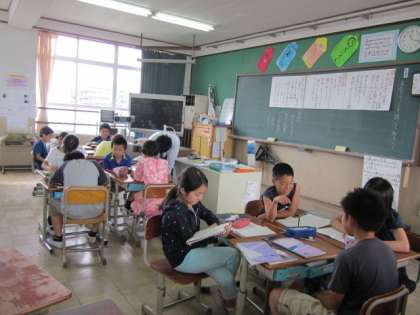 5年2組です。1時間目の外国語活動と3時間目の国語の様子です。国語は話してと聞き手に分かれてグループでインタビューをしています。