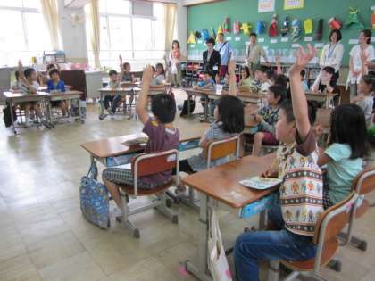 1時間目の算数と3時間目の英語活動です。算数では、筆算の計算の仕方を数え棒を使って学習していました。