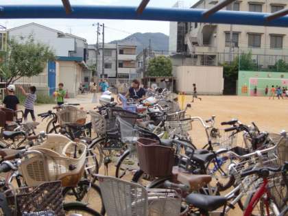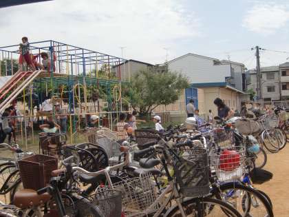 自転車で来校された方のために駐輪スペースを運動場の北端に設けましたが,満車状態です。たくさん来てくださったんだなと喜んでいます。