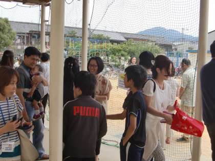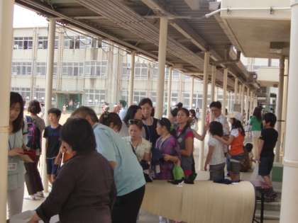 渡り廊下では水着の販売や愛のひとしずくの鉛筆販売などがありました。日差しが強くなってきて,ちょうど日蔭になるこの渡り廊下はずいぶんな人だかりでした。