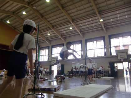 体育館で走り高跳びをしています。軽がるとバーを跳び越える子はいかにもバネのあるしかも身軽な様子を見せつけます。