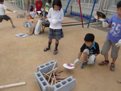 5年生が田植えをしている頃,運動場のうんていの辺りでは煙が上がっていました。