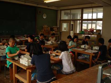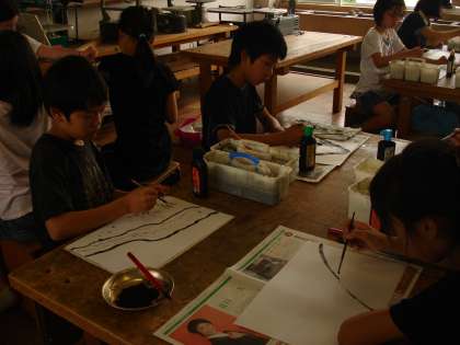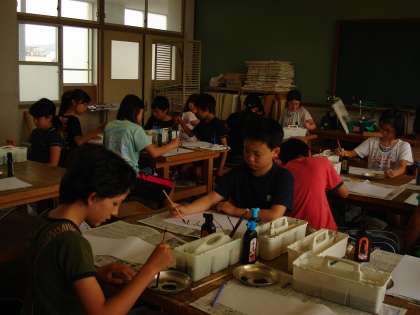前回の作品を鑑賞し、いいところをたくさん見つけたあと、和紙に昔話の挿絵をイメージして墨を使って描きました。一人一人が集中して、すてきな作品ができました。