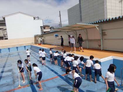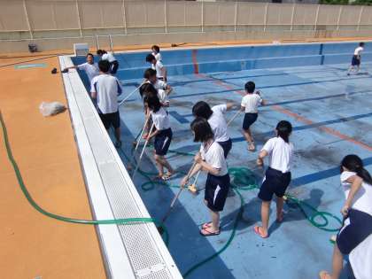 今日の午後,プール掃除をしました。5校時は5年生,6校時は6年生が頑張ってくれました。1年分の汚れがしっかり落とされました。