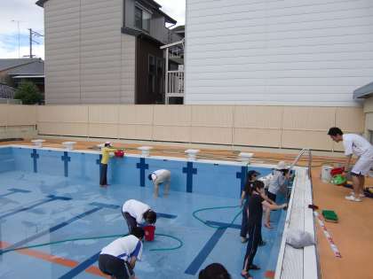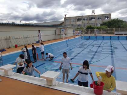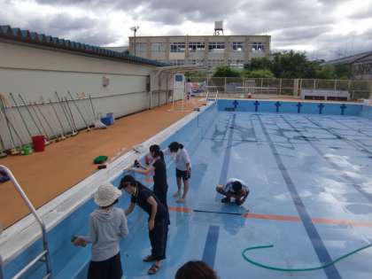 プール掃除の仕上げはもちろん教員です。台風の影響を受けて空一面に雲が出ています。しかもその雲がかなりの速さで流れています。そんな穏やかでない空模様ですが,教員が総出でプール掃除の仕上げをしました。