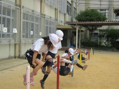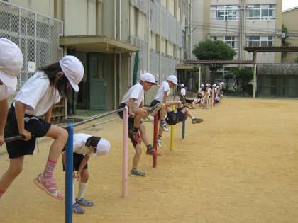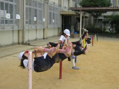 「ひざかけふり上がり」の練習をしました。最初は,伸ばした足での弾みのつけ方が難しかったようですが,何度も練習するうちに振る足がまっすぐに伸びて,できるようになってきました。
