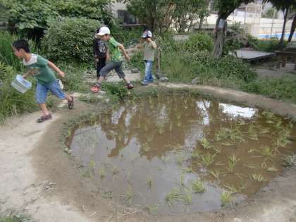 今年はビオトープの池の水位が低いので田んぼに水を入れた後も,水路をふさがずにそのままにしてあります。メダカを田んぼに誘い込むためです。水温の高い田んぼでメダカは卵を産みます。昨年は田んぼでたくさんのメダカが誕生しました。今年も期待できそうです。