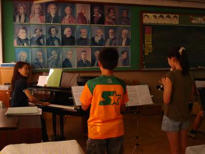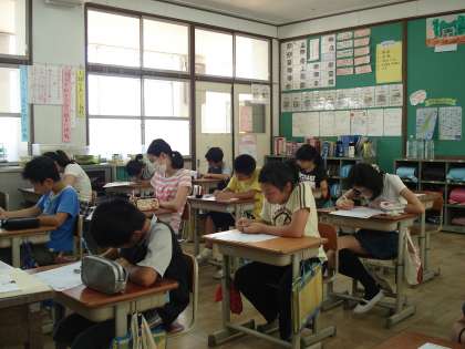 1つは、音楽のリコーダーのテスト。藤原先生のピアノに合わせ、2人ずつが演奏しました。少し緊張気味の様子でしたが、きれいな音色が響いていました。