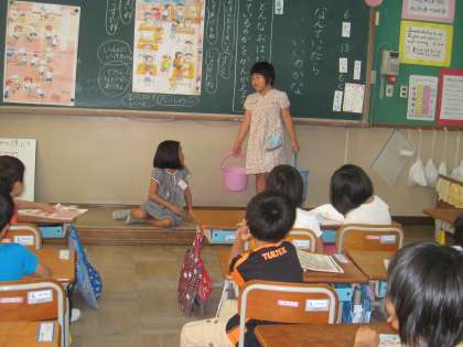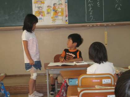 国語「なんていったらいいのかな」の学習で,教科書の絵を見て,いろいろな場面でのやりとりを見つけ,絵の中でどんな会話をしているのかを考えて発表し合いました。