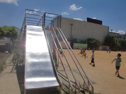 そういうわけで,今日の休み時間は鉄製の遊具を『使用禁止』にしました。特にすべり台はやけどしそうです。写真を見ても,その熱さが伝わるでしょ。