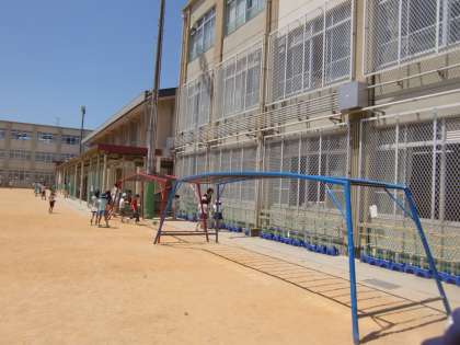 2時間目の体育で2年生が鉄棒の練習をしようとしたところ熱くてつかめません。急遽,鉄棒に水をかけて少し冷ましてから練習をしました。