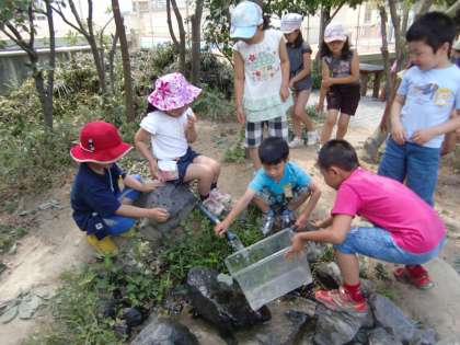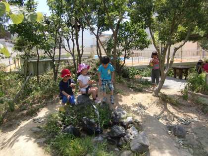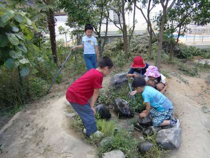 ビオトープの一番高く土を盛ったところから井戸水が出ています。池やせせらぎの水源です。冬温かく,夏冷たい井戸水です。特に今日のように気温が高い日は人気のスポットです。