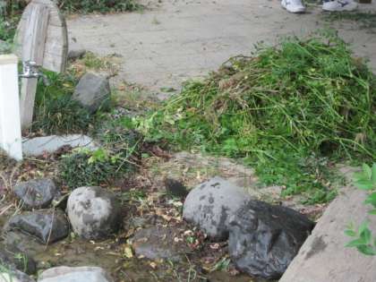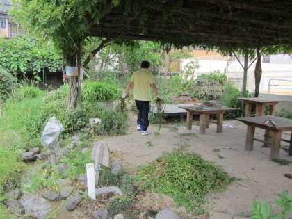 校長先生は、せせらぎにたくさんの草が生え茂っているので、子どもたちが落ちてはいけないと、草ぬきをしてくださっています。