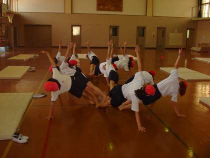 今日は、今まで一人技として練習してきた技を友だちと合わせて大きな技にしました。