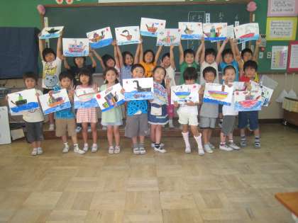 みんな上手に音読発表ができました。最後はみんなで,上手に描けた船の絵を手に持ってはい,ポーズ!!