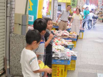 3年生の総合的な学習の時間には、毎年秋に、出町の桝形商店街の皆さんにお世話になって、いろいろなお店で販売体験をさせていただいています。