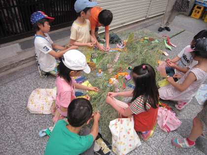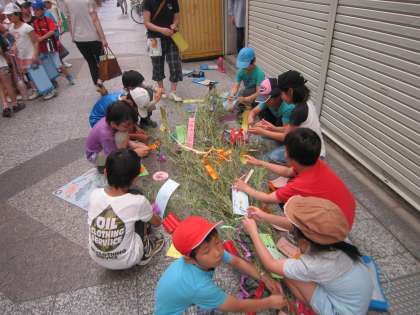大きな笹に3年生一人ひとり、みんなの願いごとを飾り付けました。自分の願いだけでなく、人の幸せを願っている願いごとがたくさんありました。家族や友だち、日本の人々や世界の人々など。自分だけの願いだけでなく、他人を思いやる心を願いごとからも感じました。商店街の皆さんも、あたたかく見守ってくださいました。