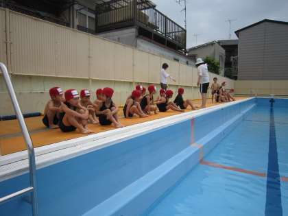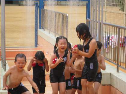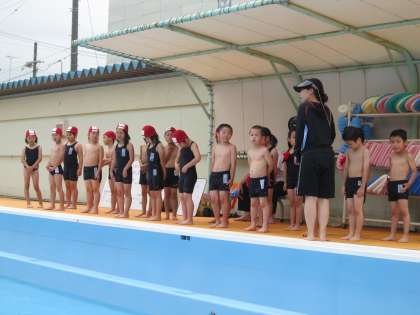 いよいよプール学習が始まりました。1年生は、初めての大きなプールに興奮気味です。でも、大きな声を出さないで、しっかり話を聞いて学習するのが四錦の子どもたちのすごいところです。冷たいシャワーも、どの子も困っておらず、楽しそうでした。