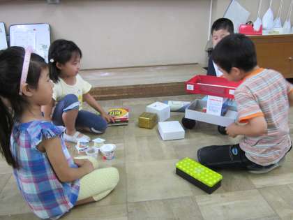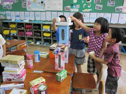算数の学習「いろいろなかたち」で,みんなが持ちよった箱や缶でグループでいろんなものを作りました。それぞれ楽しんで作れました。家の方でたくさんの箱や缶を集めてくださりありがとうございました。