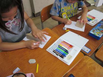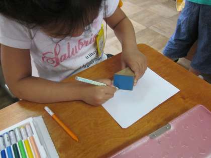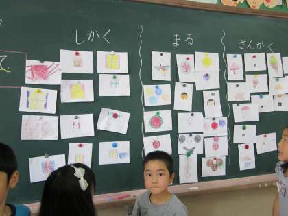 積み木の面を写しとり,面の形の特徴を利用した絵をかくことで平面図形に親しみました。