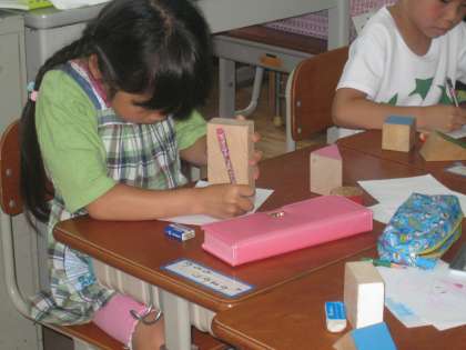 積み木の面を写しとり,面の形の特徴を利用した絵をかくことで,平面図形に親しむことができることをねらいとした学習活動です。